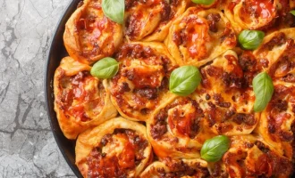 - Kata katikati ya kila bun. Weka brisket ndani, jaza juu na safisha yai na uinyunyiza na jibini.